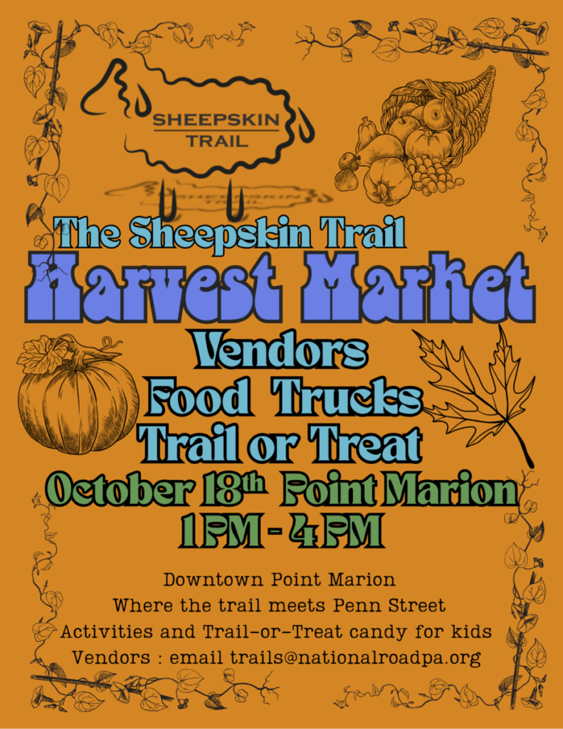 Join us for the first annual Sheepskin Trail Harvest Market & Trail-or-Treat in the heart of downtown Point Marion! This festive fall celebration will transform the Sheepskin Trail near Penn Street into a lively outdoor market filled with: